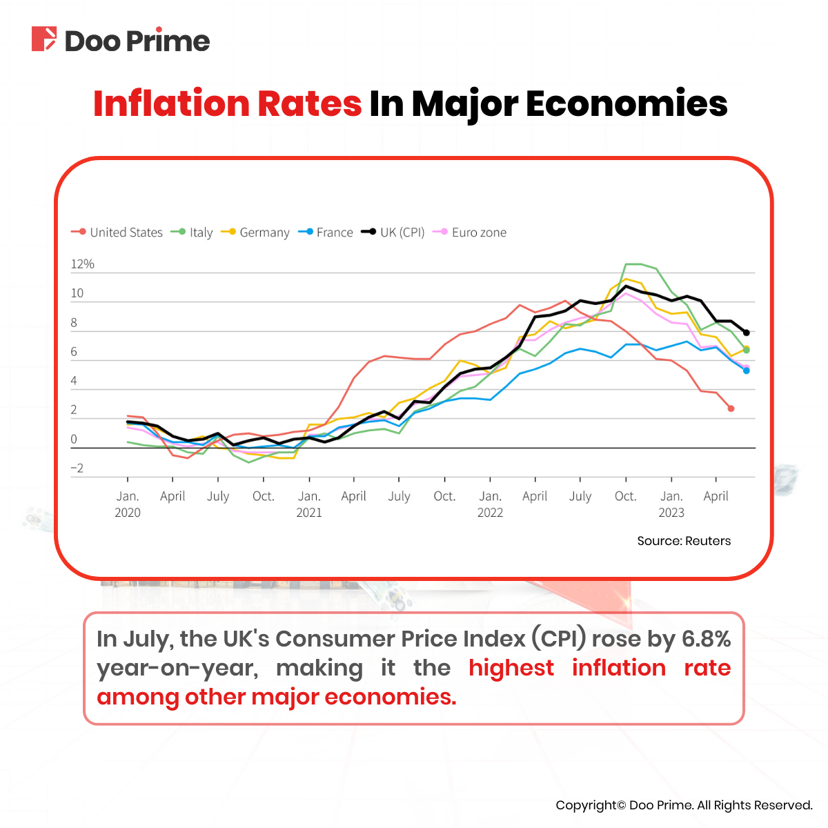 The UK faces the highest inflation rate compared to other major economies. In July, the UK Consumer Price Index (CPI) rose by 6.8% year-on-year, more than three times the 2% target. This contrasts with the Eurozone’s July inflation rate of 5.3% and the U.S. CPI’s 3.2% year-on-year increase in July.