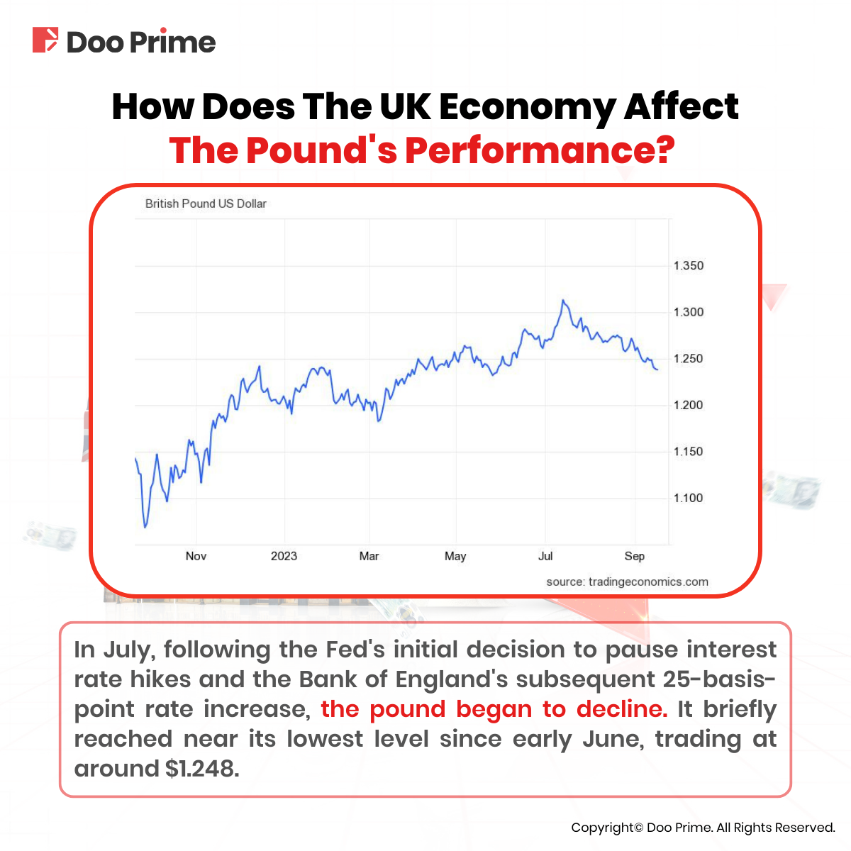 Historically, substantial rate hikes by the Bank of England led to a steady increase in the pound sterling against the U.S. dollar. However, when the Federal Reserve paused rate hikes in July, and the Bank of England raised rates by 25 basis points, the pound began to decline, nearing its lowest point since early June, around $1.248.