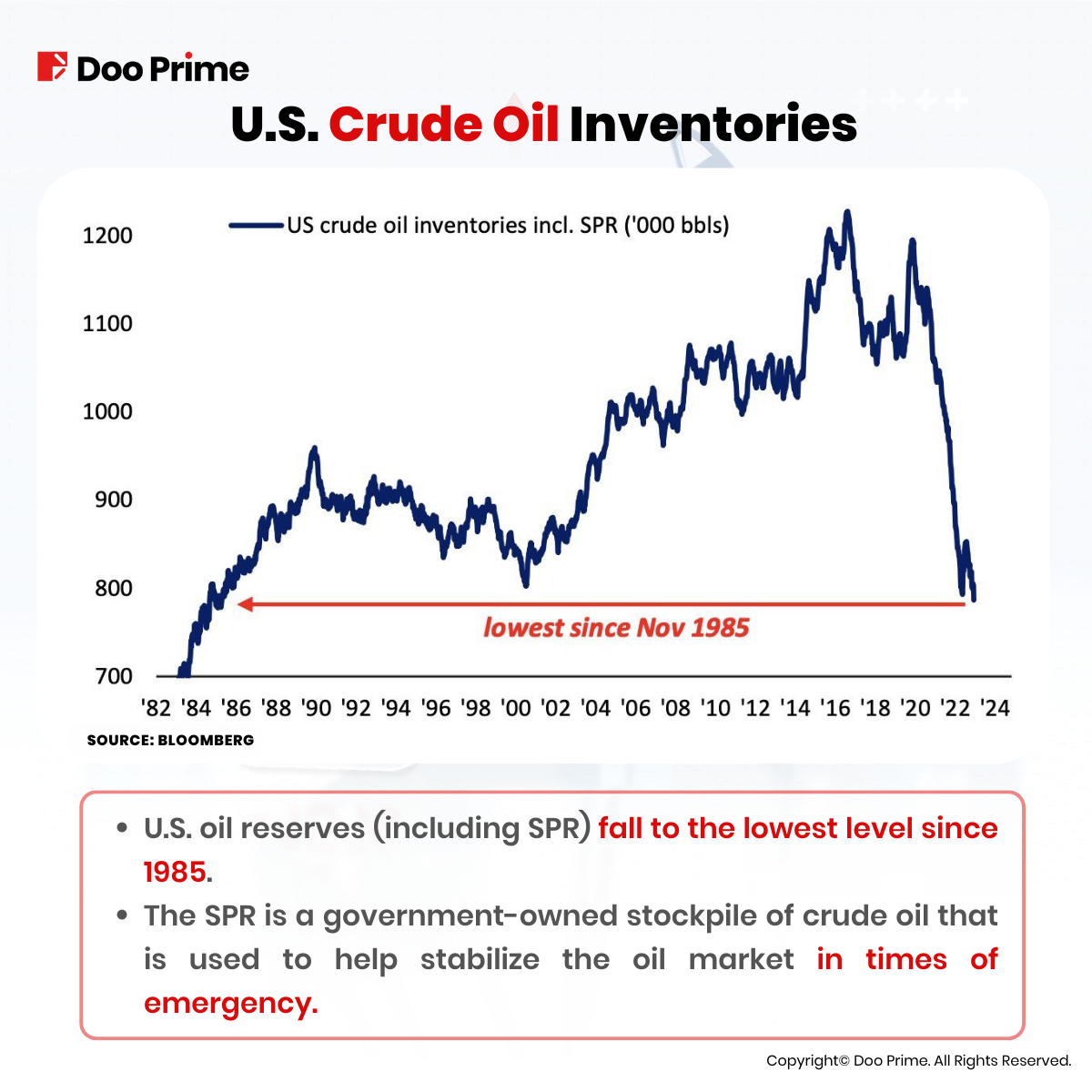 The Strategic Petroleum Reserves are being depleted day by day. Higher oil prices have been a major contributor to inflation which the Federal Reserve and U.S. government have been fighting for 2 years now. If OPEC+ and Russia continue to reduce oil production, it will push inventories lower and demand will likely increase, which could send oil prices much higher towards USD 90-100 by the end of this year.
