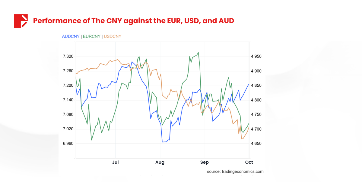 The chart below shows the performance of the CNY against the EUR, USD, and AUD.