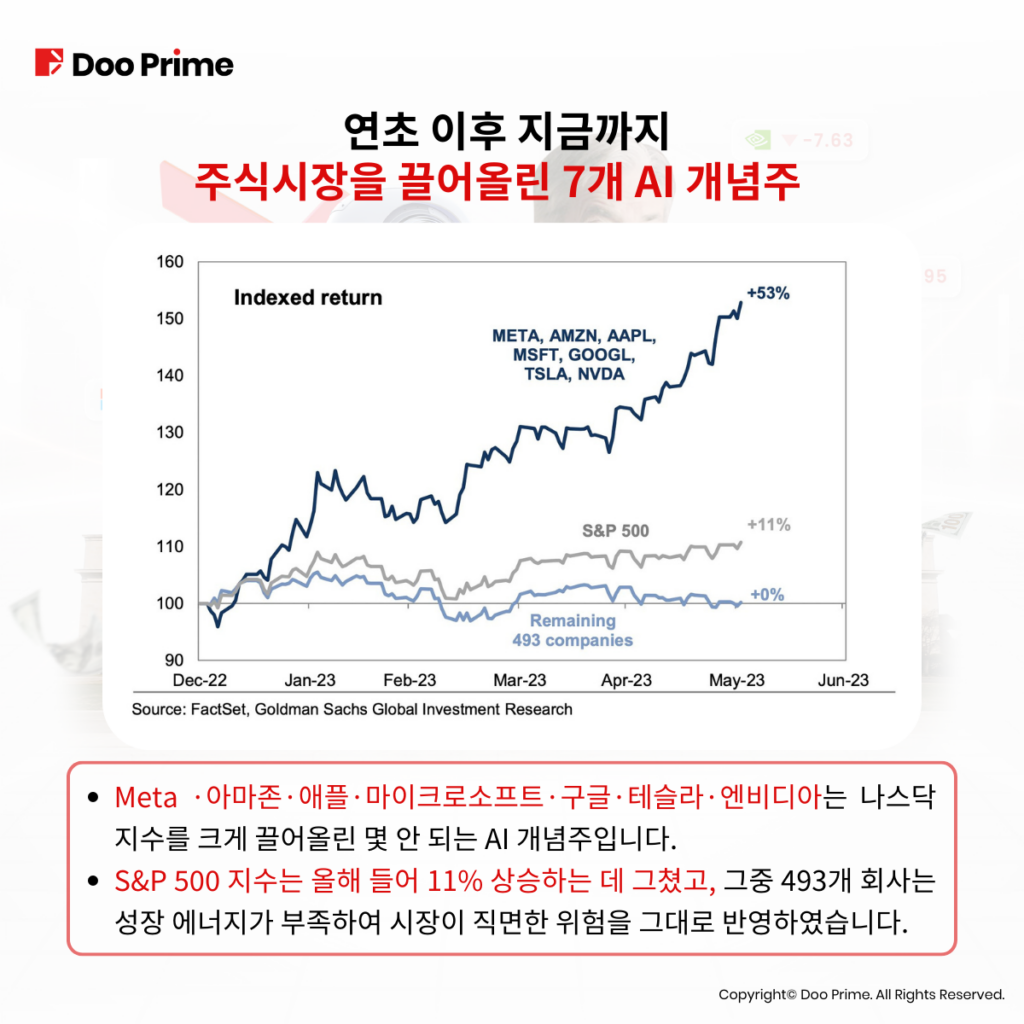 AI는 현재 시장에서 가장 인기 있는 추세이며 투자자들은 이 분야의 발전 전망에 특별한 관심을 기울였고 시장의 다른 분야에는 무관심하였습니다. Meta, 아마존, 애플, 마이크로소프트, 구글, 테슬라, 엔비디아 등 7개 AI 개념 주는 최근 몇 달간 사상 최고치로 치솟은 가운데 Meta의 주가는 올 초 이후 두 배 이상 올랐습니다. 그러나 같은 기간 S&P 500 지수의 나머지 구성주는 성장 에너지가 부족했습니다.