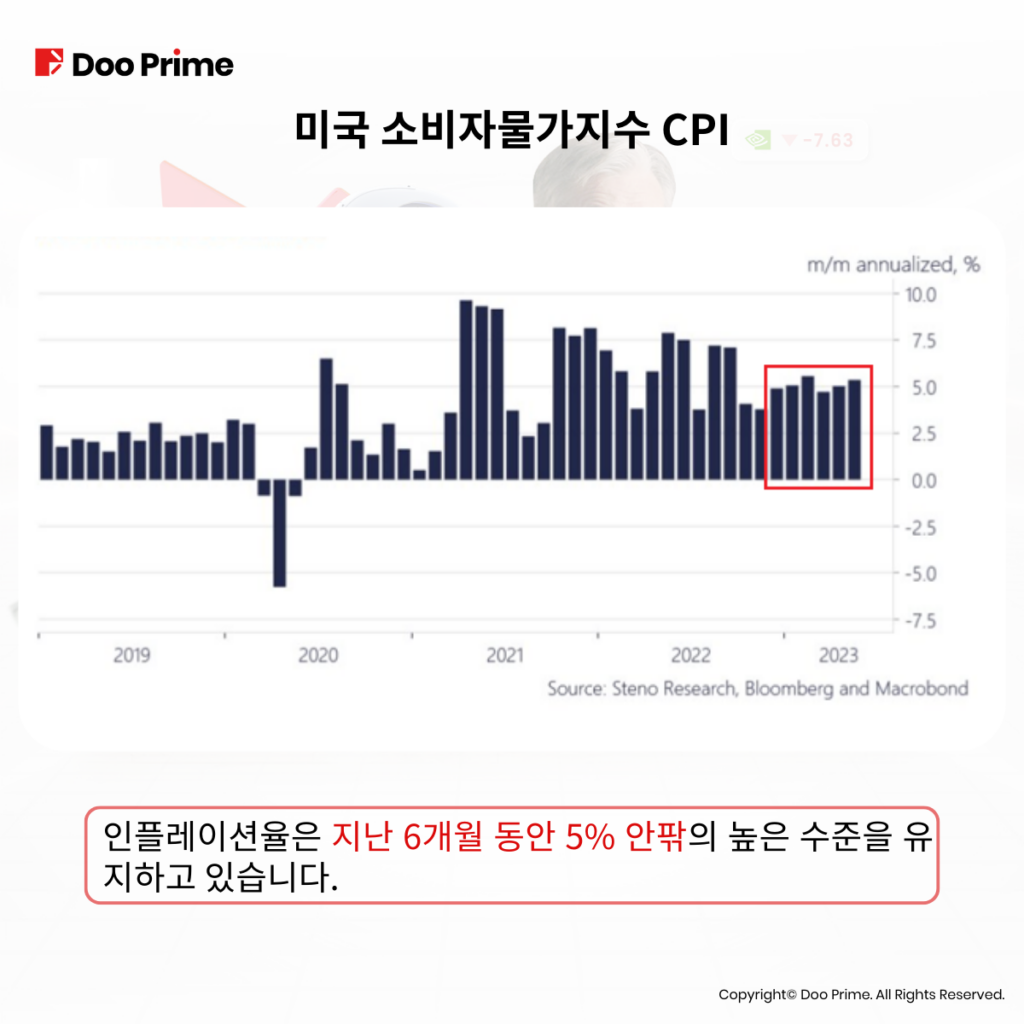 지난 몇 달 동안 인플레이션율이 5% 안팎을 맴돌면서 연준은 결국 ‘금리 인상 일시 중단’을 결정했습니다. 제롬 파월 연준 의장은 2% 인플레이션 목표까지는 “아직 갈 길이 멀다”라며 인플레이션에 맞서겠다는 의지를 재확인해 앞으로 추가 금리 인상이 예상됩니다. 파월 장관의 발언 이후 7월에 25bp 금리 인상 확률은 80%로 높았고, 9월에 두 번째 금리 인상 확률은 15%였습니다. 연준은 양보할 것 같지 않습니다.