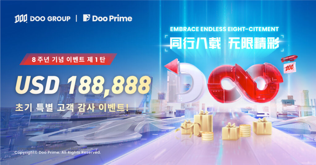 Doo Prime 소속 그룹인 Doo Group은 글로벌 투자자들과 8년 동안 함께하며 무한한 가능성을 개척해 나가며 우리의 발전 과정을 지켜봤습니다. 올해 Doo Group은 투자자에 대한 아름다운 축원을 기탁할 뿐만 아니라 더 멋진 거래의 미래를 계속 볼 수 있기를 기대합니다! Doo Prime은 현재 기념일에 맞춰 다양한 이벤트를 진행하고 있으며 투자자들을 위한 다양한 혜택과 8주년 한정판 골드 굿즈를 획득하실 수 있습니다.