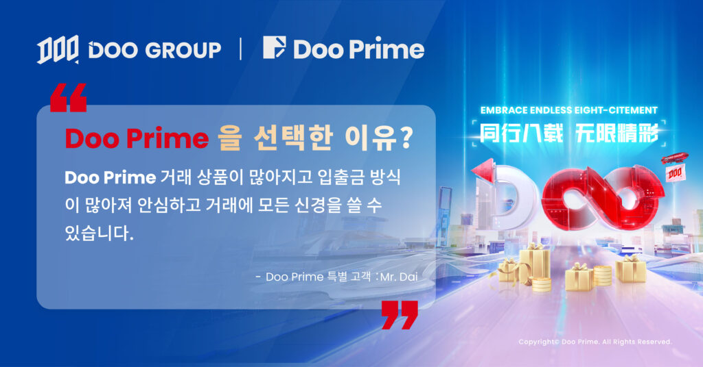 Mr. Dai 는 Doo Prime 플랫폼의 사용자이며 Doo Prime과 6년을 함 했습니다. 그는 “저는 Doo Prime의 발전을 지켜봐왔습니다. 돌이켜보면 정말 잘한 선택이였습니다. Doo Prime에 거래종목이 점차 풍부해지고 입출금 방식도 다양해져 밑고 사용할 수 있으며 모든 정력을 거래에 전념할 수 있었습니다.”고 말했습니다.