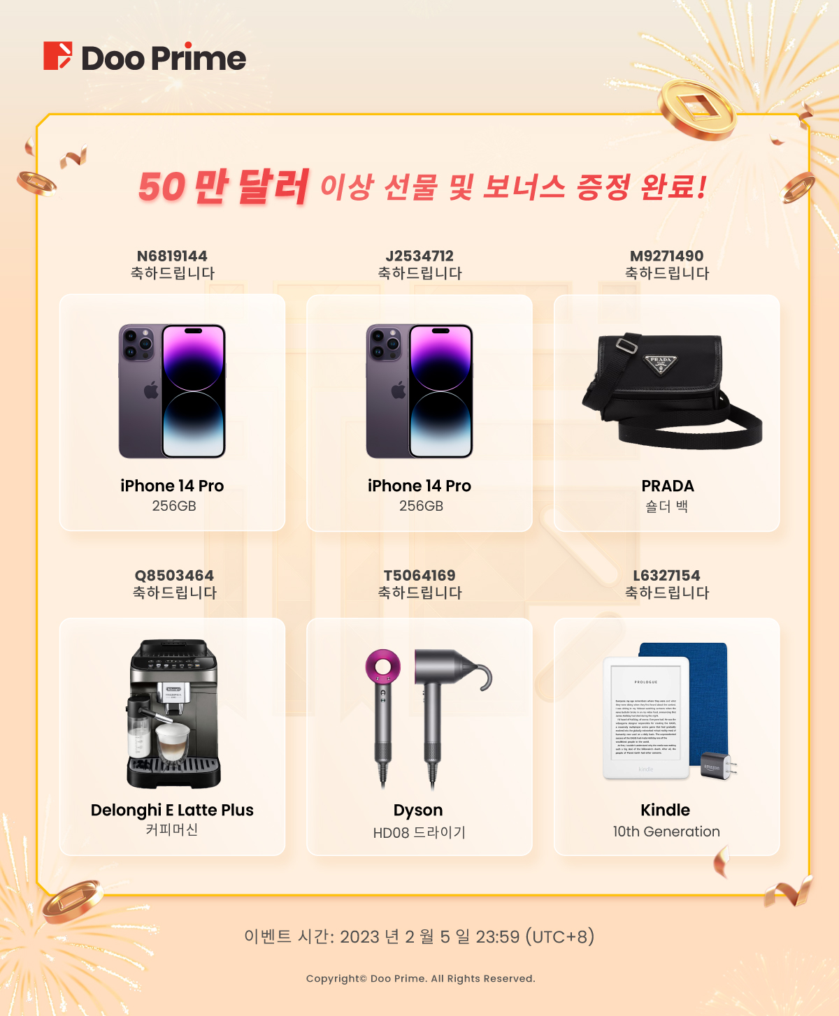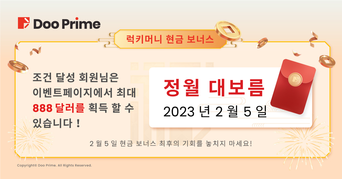 이 전 Doo Prime은 총 7회에 나누어 현금 보너스 추첨을 진행하였습니다. 고객님들의 뜨거운 반응속에서 마지막 보너스 추첨은 2023년2월5일 00:00-23:59 (UTC+8) 정월 대보름날 정시에 진행 될 예정입니다. 전 세계 투자자분들께서 행운 추첨을 통해 모두 거래에 큰 성과와 한 해 동안 행복이 가득하기를 진심으로 기원합니다.