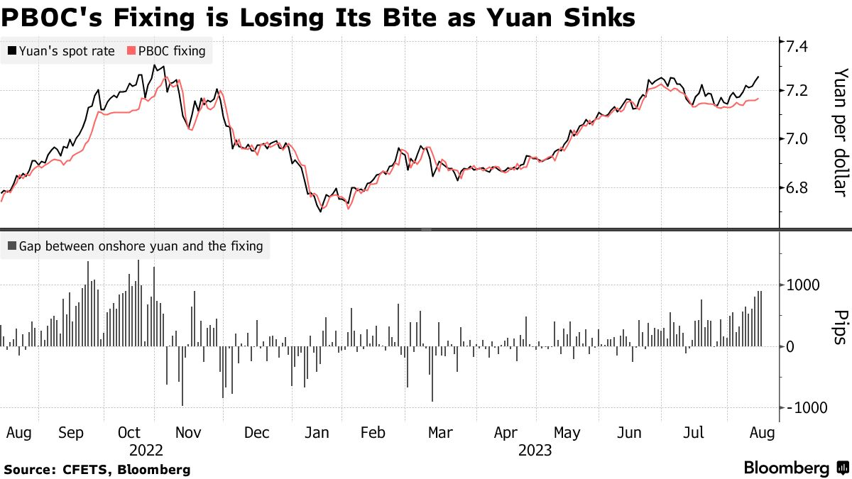 China’s yuan is plumbing fresh lows for the year with the central bank’s favorite tool for guiding the managed currency quickly losing its effectiveness.