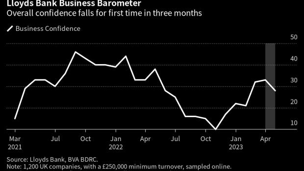 UK business confidence fell for the first time in three months as unexpected inflation figures weighed on firms’ sentiment about the economy, as indicated by a survey by Lloyds Banking Group Plc.