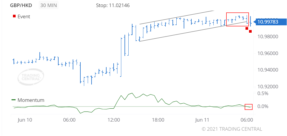 The Momentum oscillator crossed below 0 on 2021 Jun 11 at 06:30 GMT, thereby signaling a new accelerating downtrend.