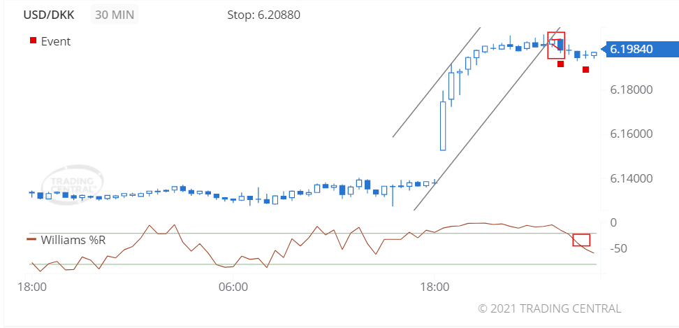 The Williams %R indicator triggered a bearish signal on 2021 Jun 17 at 03:00 GMT, having fallen out of overbought (-20 level) and continued on to cross below the -50 level.