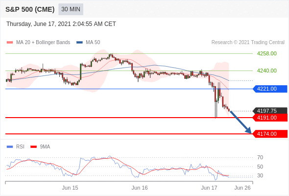 Short positions below 4221.00 with targets at 4191.00 & 4174.00 in extension.