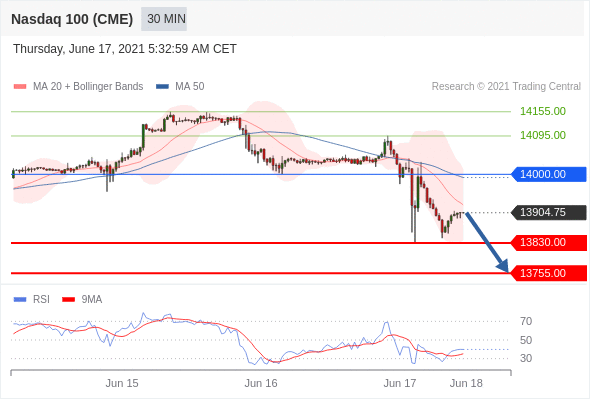 As long as the resistance at 14000.00 is not surpassed, the risk of the break below 13830.00 remains high.