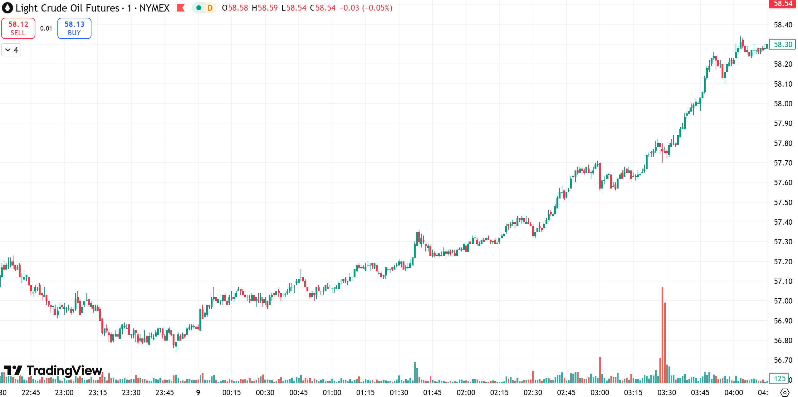 WTI crude traded around $58.40 per barrel after surging more than 3% on Thursday, driven by fresh supply-side risks.