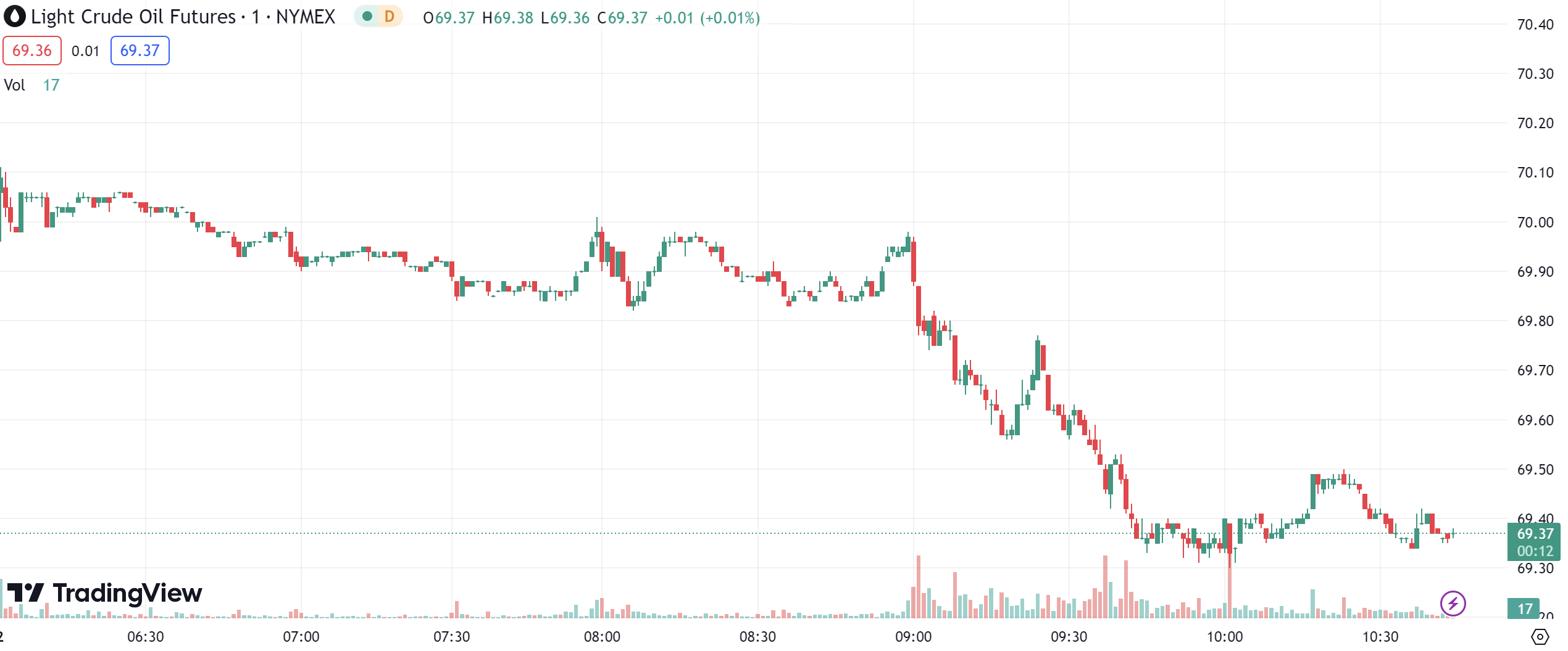 During the Asian and European sessions, there was a minor pullback, briefly touching the resistance level at USD 71.9 before retreating again. In the late U.S. session, prices declined further, breaking below the USD 71 level and reaching around USD 70.4, where they encountered resistance and closed with a fluctuation.