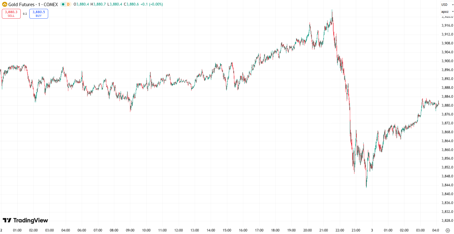 Technical levels: Gold opened at $3,866.4/oz, dipped to $3,852.1/oz, hit a record $3,897.3/oz, dropped to $3,819/oz, then rebounded to close at $3,854.7/oz, forming a long-legged doji candlestick.