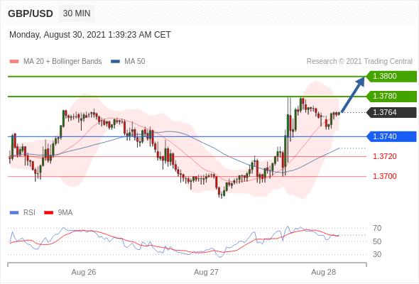 在 1.3740 之上,看涨,目标价位为 1.3780 ,然后为 1.3800 。
