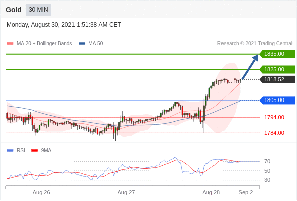 在 1805.00 之上,看涨,目标价位为 1825.00 ,然后为 1835.00 。