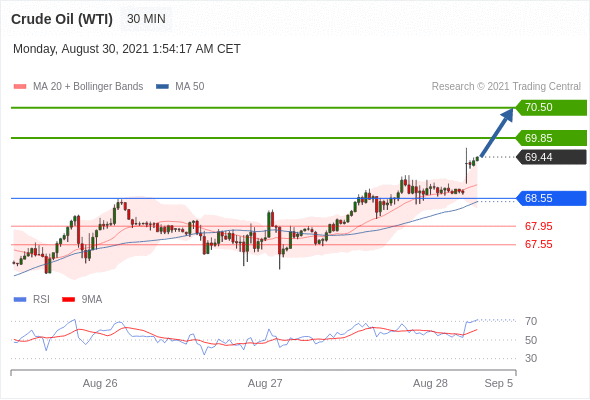 在 68.55 之上,看涨,目标价位为 69.85 ,然后为 70.50 。