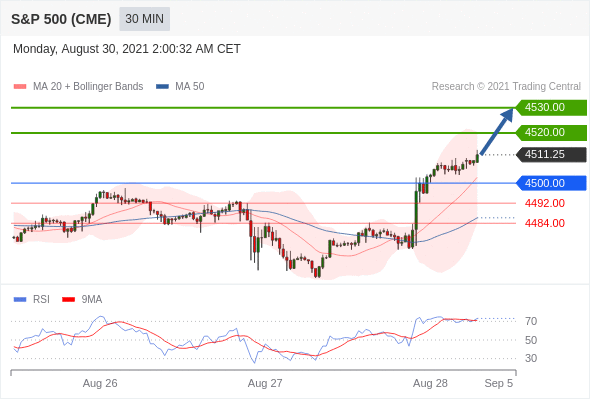 在 4500.00 之上,看涨,目标价位为 4520.00 ,然后为 4530.00 。