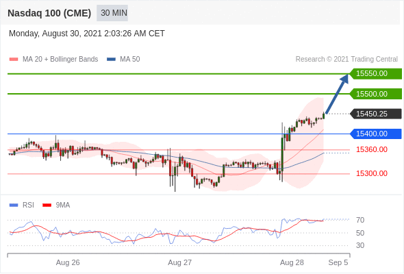 在 15400.00 之上,看涨,目标价位为 15500.00 ,然后为 15550.00 。