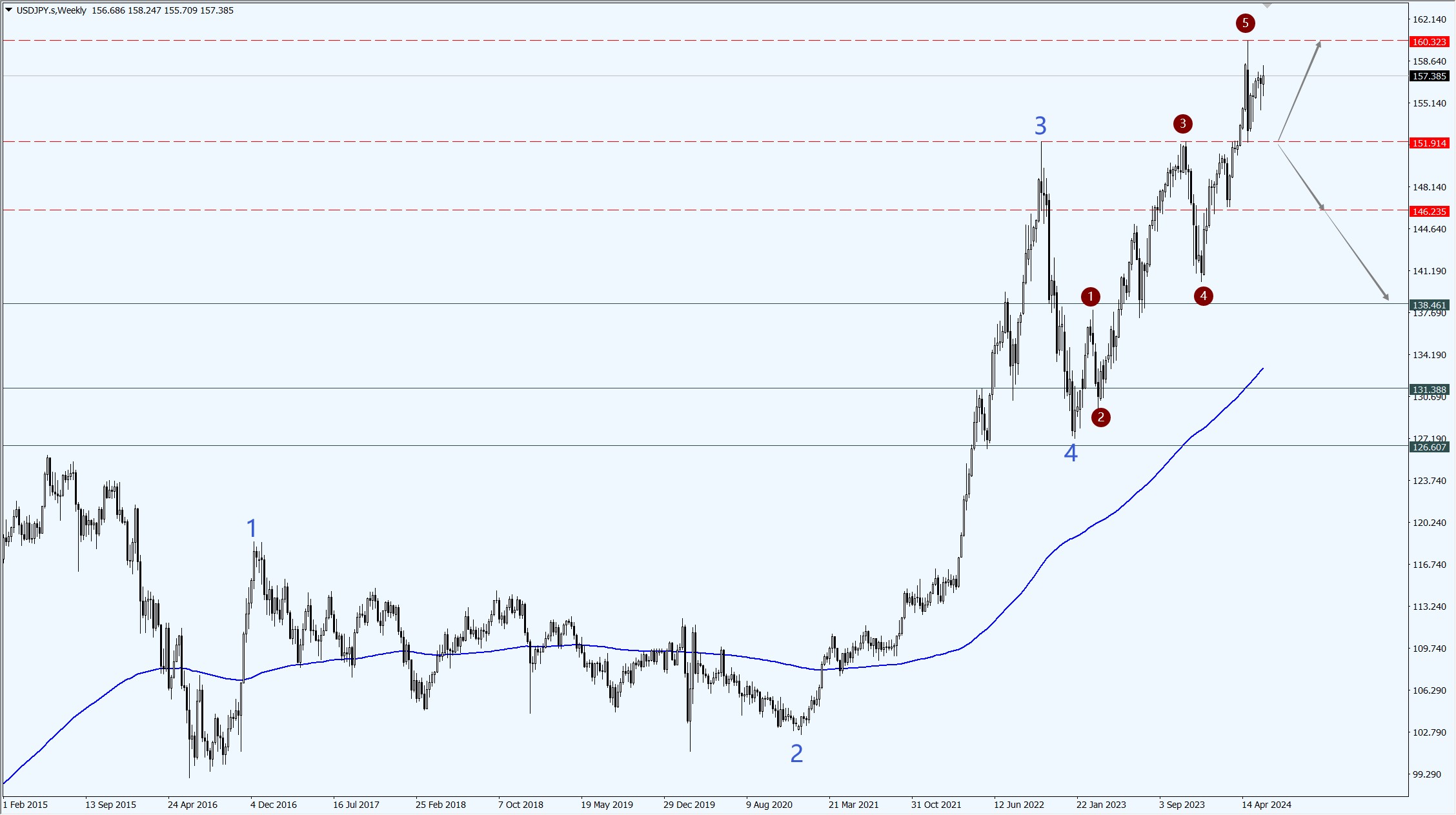 - 美元兑日元大级别的上升结构标注如图所示,目前处于阶段性转换期,因此如果下周美元兑日元稳定运行于 151.91 一线上方,则预示投机性买盘依旧不肯放手,届时,依旧存在测试 160 整数关口的可能性;