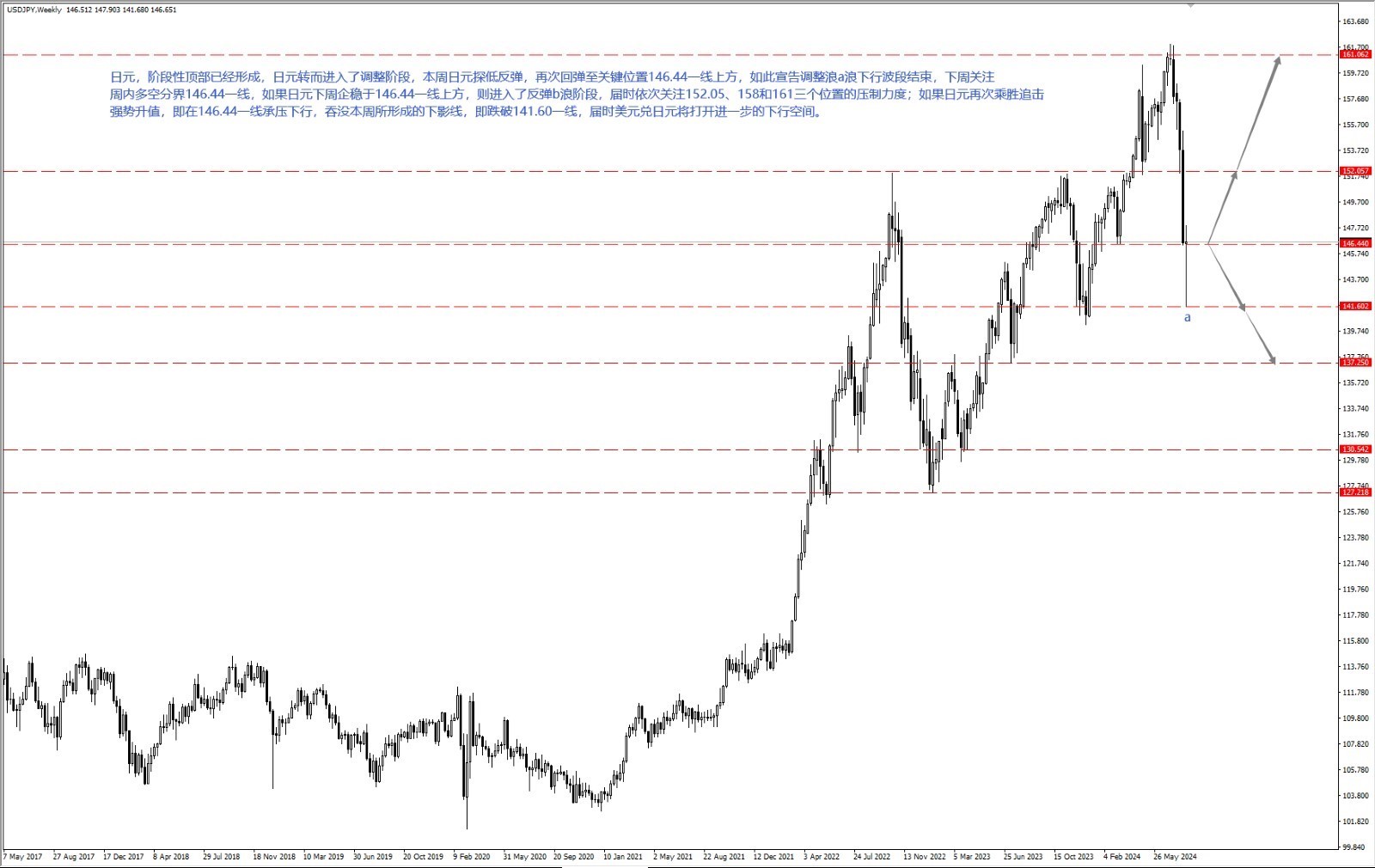 日元阶段性顶部已经形成,转而进入了调整阶段,上周日元探底反弹,再次回弹至关键位置 146.44 一线上方,如此宣告调整浪 a 浪下行波段结束。本周关注多空分界 146.44 一线,如果日元企稳于 146.44 一线上方,则进入了反弹 b 浪阶段,届时依次关注 152.05、158 和 161 三个位置的压制力度;如果日元再次乘胜追击强势升值,即在 146.44 一线承压下行,吞没上周所形成的下影线,即跌破 141.60 一线,届时美元兑日元将打开进一步的下行空间。