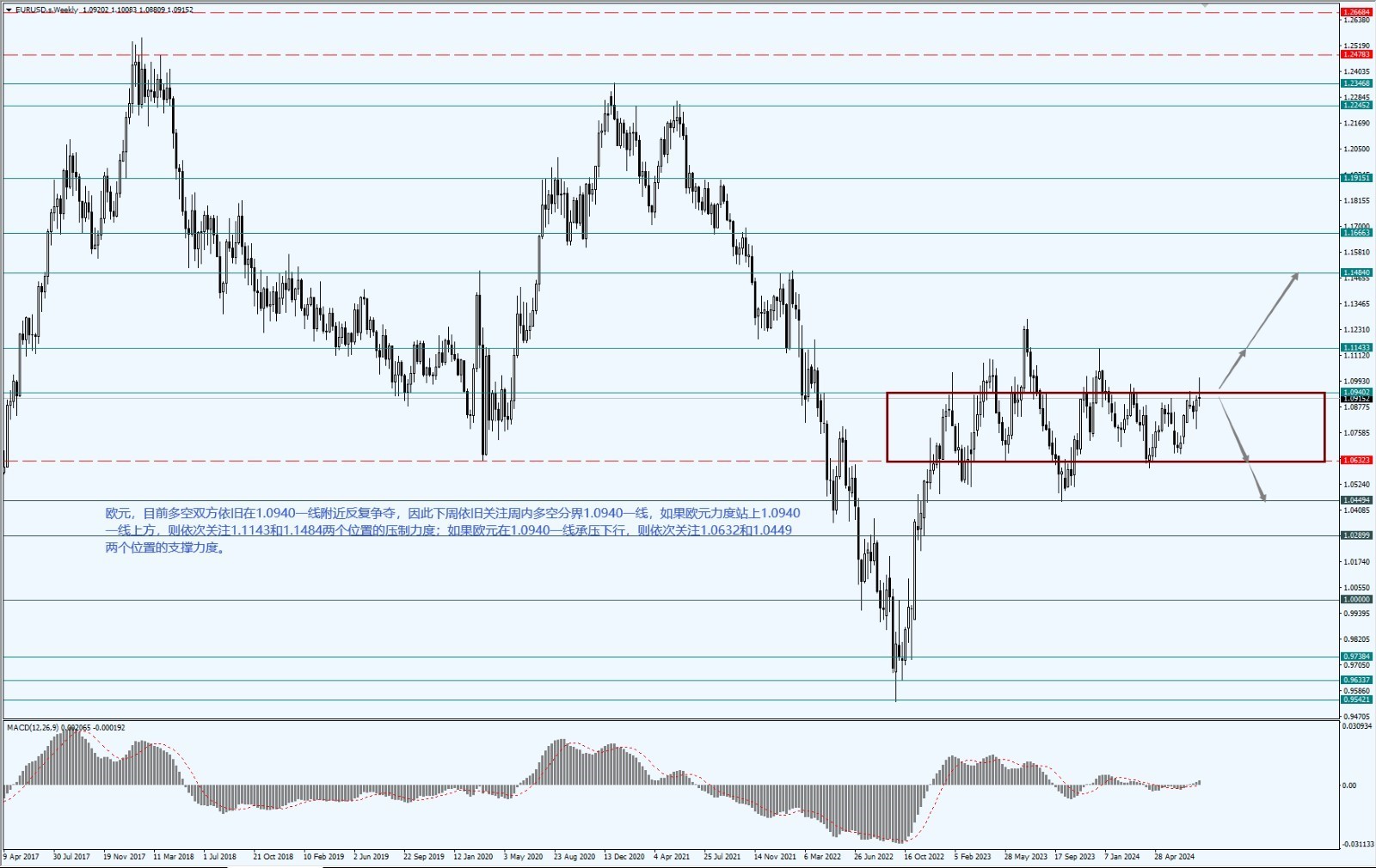 目前多空双方依旧在 1.0940 一线反复争夺,因此本周依旧关注多空分界 1.0940 一线,如果欧元力度站上 1.0940 一线上方,则依次关注 1.1143 和 1.1484 两个位置的压制力度;如果欧元在 1.0940 一线承压下行,则依次关注 1.0632 和 1.0449 两个位置的支撑力度。