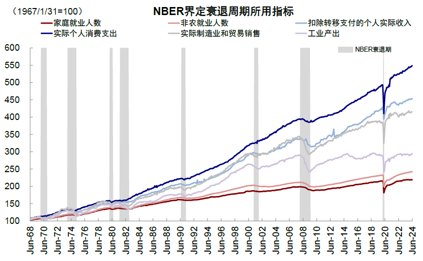 首先要理清什么是经济衰退?经济衰退是指经济活动严重、广泛且长期的低迷。主要考察的指标包括扣除转移支付后的个人实际收入、非农就业、家庭调查就业、实际个人消费支出、实际制造与贸易销售、以及工业产出。在认定衰退时,则要综合考虑深度、广度、以及持续时间。