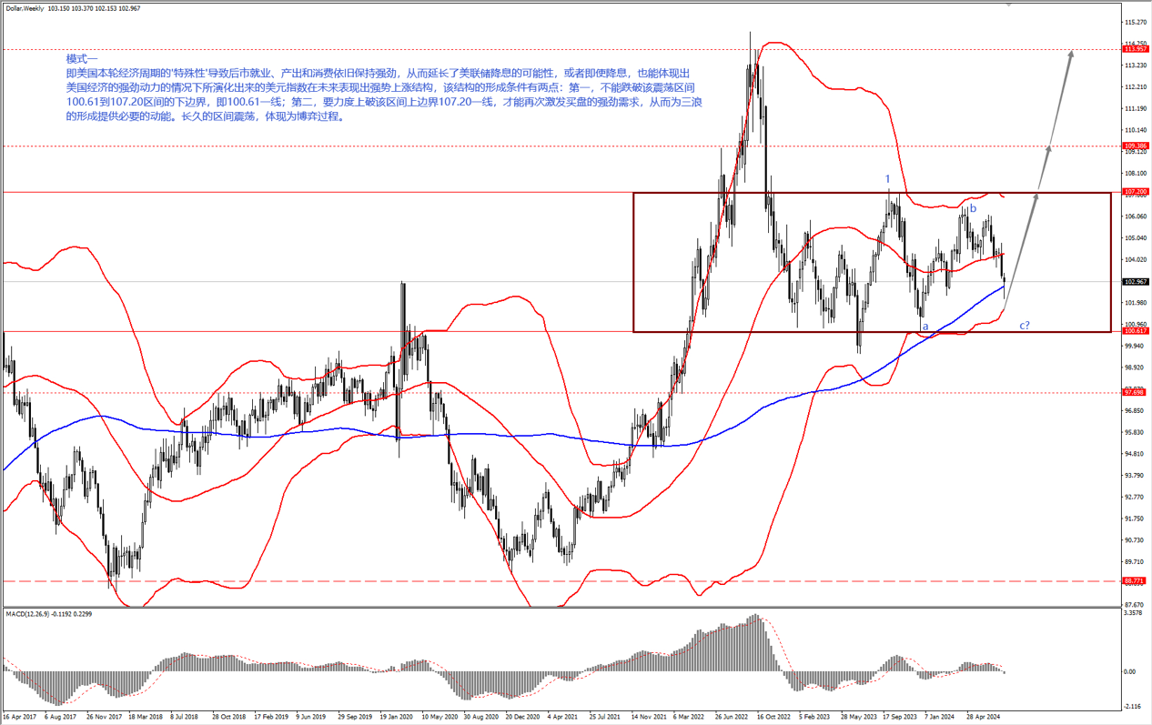 模式一:即美国本轮经济周期的“特殊性”道指导致后市就业、产出和消费依旧保持强劲,从而延迟了美联储降息的可能性,或者即使降息,也能体现出美国经济的强劲动力的情况下,所演化出来的美元指数在未来表现出强势上涨结构,该结构的形成条件有两点:第一、不能跌破该震荡区间 100.61 到 107.20 区间的下边界,即 100.61 一线;第二、要力度突破该区间上边界 107.20 一线,才能再次激发买盘的强劲需求,从而为三浪的形成提供必要的动能。长久的区间震荡,体现为博弈的过程。