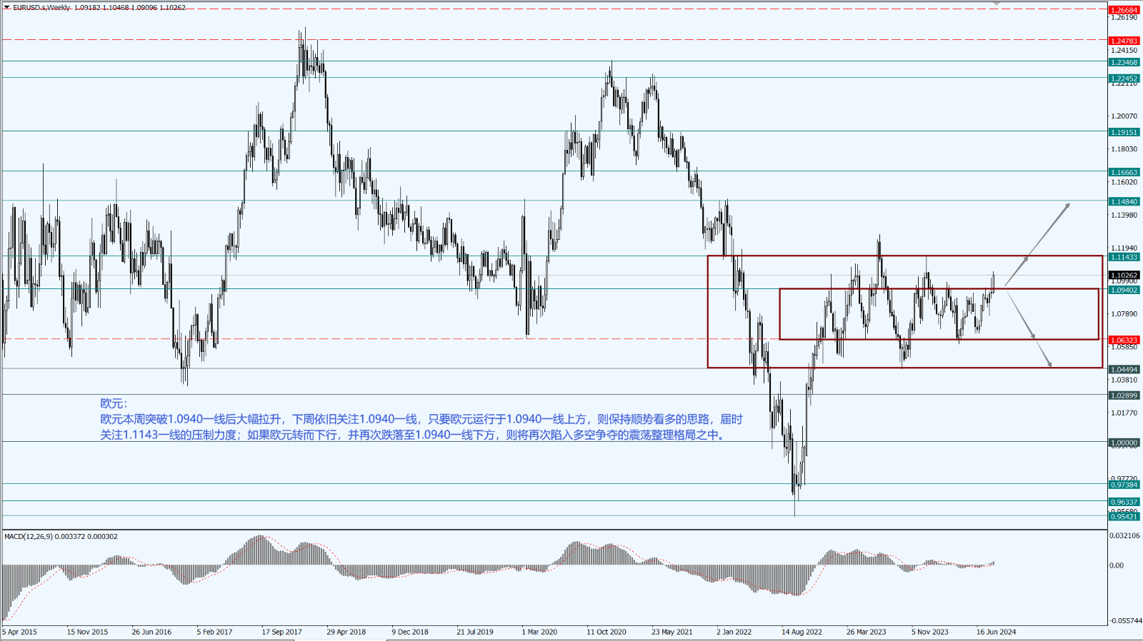 - 欧元在上周突破 1.0940 一线后大幅拉升,下周依旧关注 1.0940 一线;