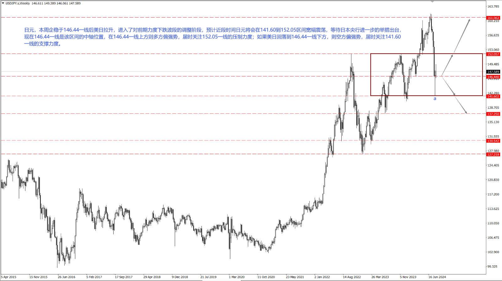 - 如果美元兑日元回落到 146.44 一线下方,则空方偏强势,届时关注 141.60 一线的支撑力度。
