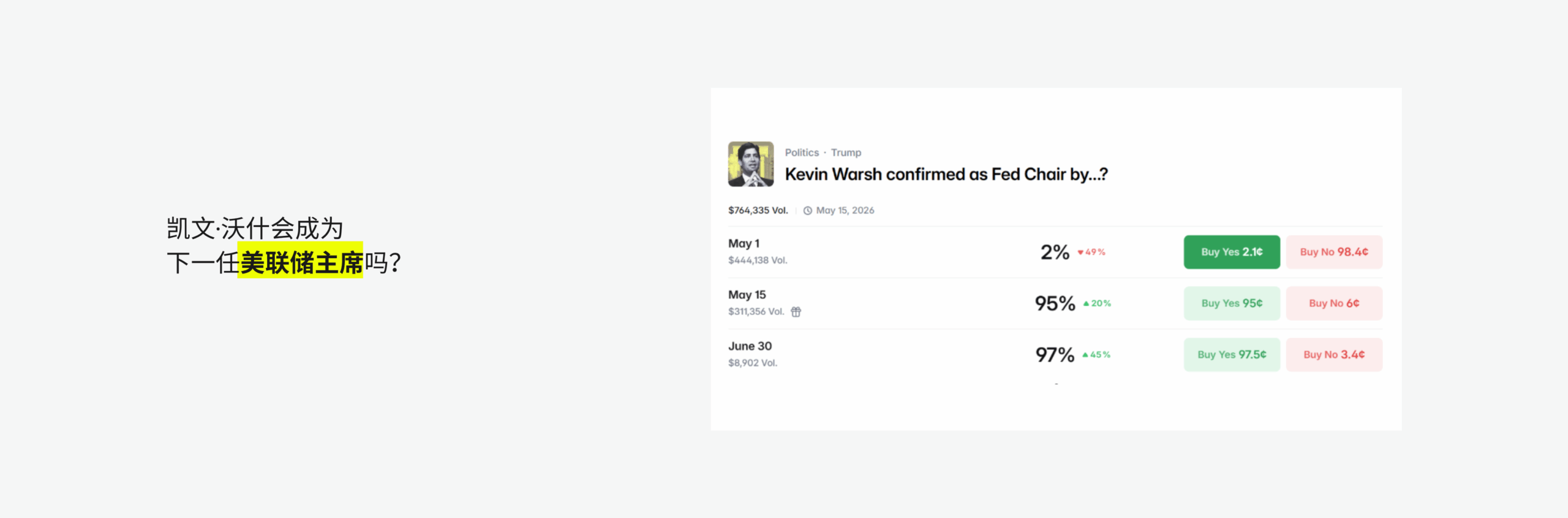 目前,市场认为沃什上任的概率很高。他在 5 月 15 日之前走马上任的概率高达 95%。
