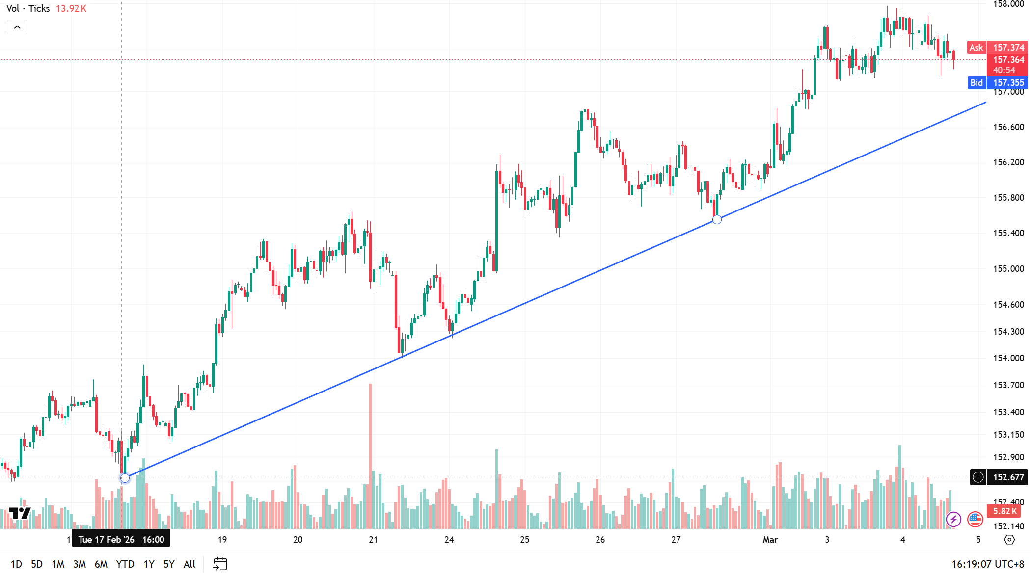 今年 2 月起,USDJPY 就处于一个上升通道中,从基本面判断,由于美元的持续强势和日元的贬值预期,上升趋势依然有可能延续,交易者们可以在上升通道中找机会交易。如果USDJPY 跌破通道,那么可能预示着趋势反转,需要及时止盈。