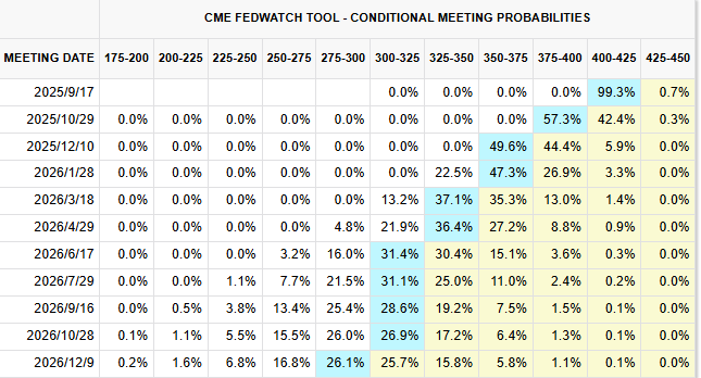 据芝商所(CME)“美联储观察”工具最新数据显示,市场普遍预期美联储将在 9 月议息会议上启动降息。当前,美联储维持利率不变的概率仅为 0.7%,而 降息 25 个基点的概率高达 99.3%。