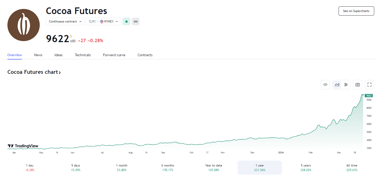 由于全球两个最大的可可生产国加纳和科特迪瓦因遭受极端天气和疾病的双重打击,可可豆产量严重下滑。可可供应紧缺,全球市场还可能进一步萎缩。纽约可可期货盘中有史以来首次触及每吨 10,000 美元,创历史新高。仅在 3 月,纽约可可期货已上涨 60%,今年以来累涨超 1 倍,伦敦可可期货也涨至每吨 8,569 美元的高位。