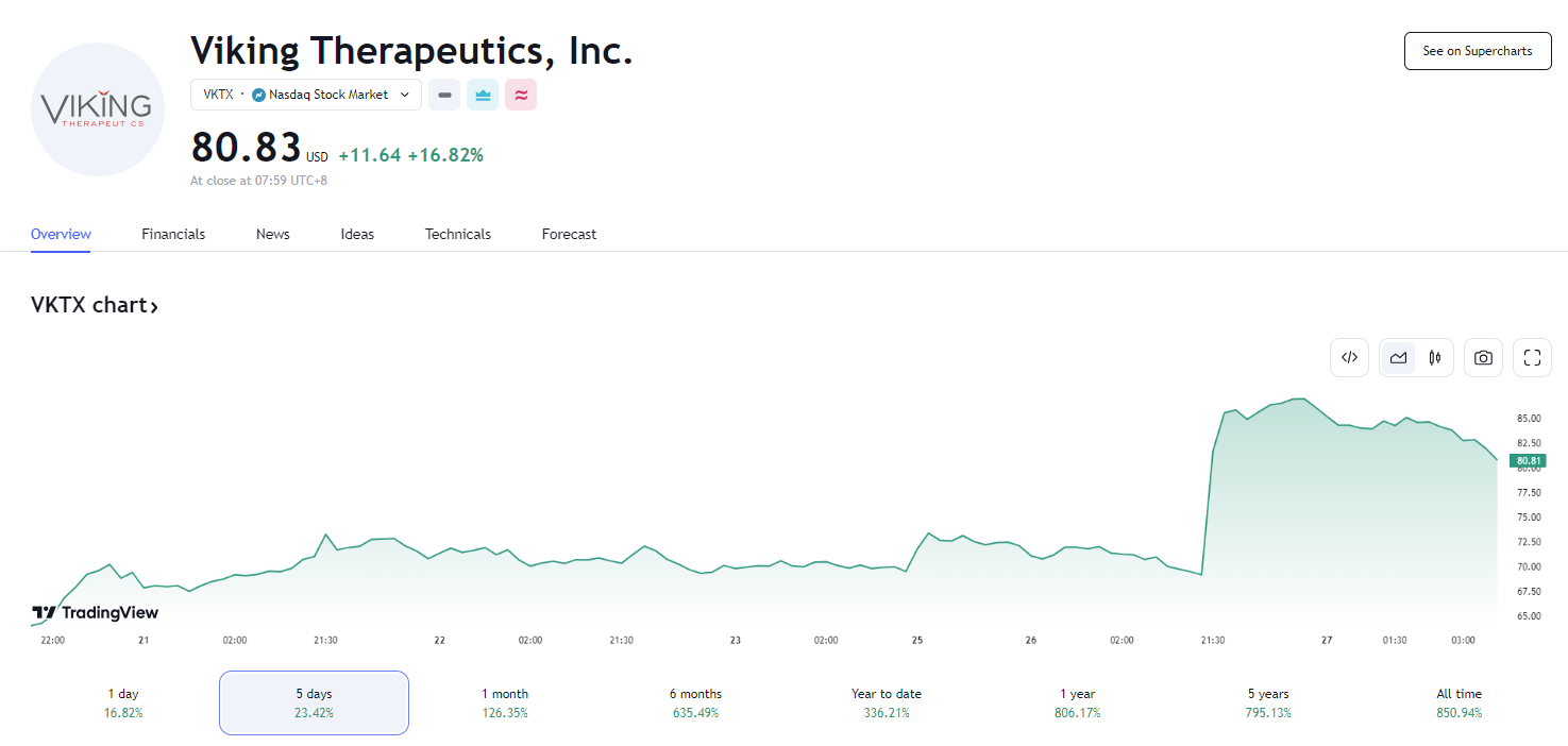 减肥药概念股、生物科技公司 Viking Therapeutics 盘中一度上涨近 28.8%,创 2 月 27 日以来最大盘中涨幅;今年迄今 Viking 已涨约 342%。Viking 大幅上涨的主要原因是其新型口服减肥药 VK2735 的早期研究结果证明,在第一期临床试验中,按最大剂量在 28 天内可以减重 5%,这一显著减肥效果与诺和诺德相当,甚至可能优于礼来。