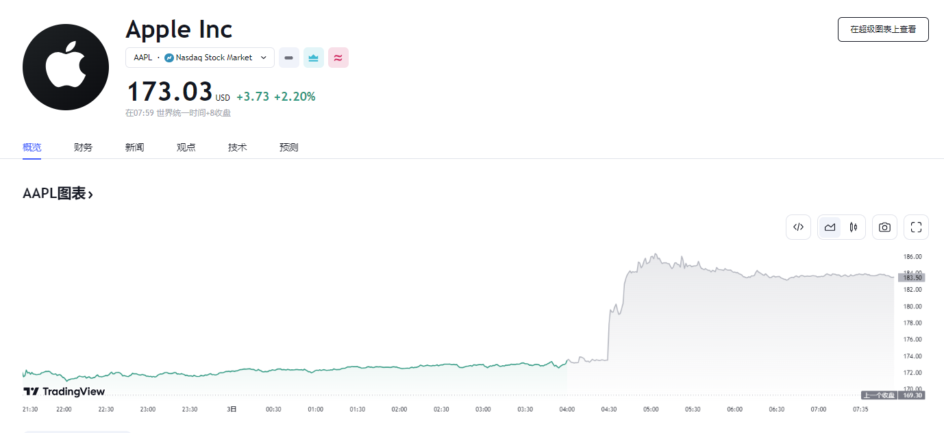 受利好此消息影响,苹果盘后股价一度涨 7.7%,对应市值增加近 2000 亿美元。