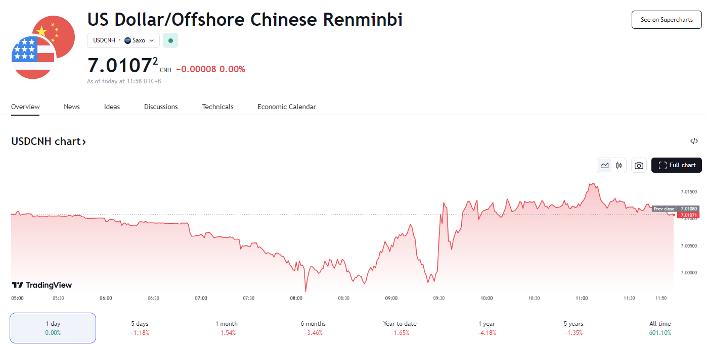 25 日早上,离岸人民币汇率(CNH)涨破 7.0 大关,为 2023 年 5 月以来的首次。 离岸人民币盘中较日低涨近 600 点、冲至 7.01 关口,创 16 个月新高。