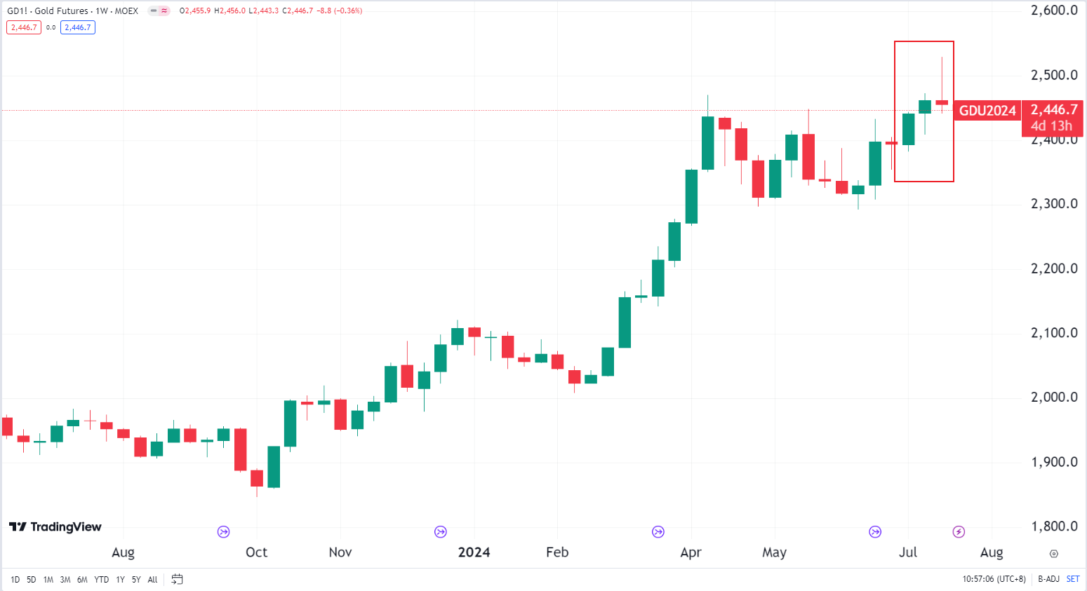 上周五,七月交割的 Comex 黄金期货下跌超过 2%,结束了连续三周的涨势。专家指出,这次金价回落的原因在于市场预期美联储最早可能于 9 月停止降息,这导致投资者进行获利回吐,加上市场对经济软着陆的预期,都对金价产生了压力。