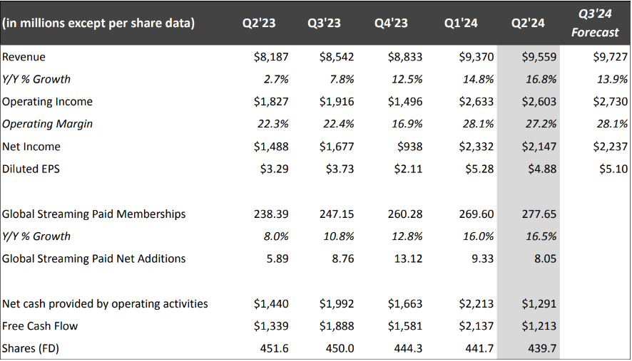 网飞(NFLX)最新公布的第二季财报显示,其营收增长了 16.7%,达到 95.6 亿美元,略高于市场预期的 95.3 亿美元。每股盈利(EPS)为 4.88 美元,也高于市场预期的 4.74 美元。全球订阅数增长了 16.5%,达到 2.77 亿,其中美加地区订阅数增长了 24%,亚太地区增长了 164%,而欧洲、中东及非洲等地区则下滑了 7.8%。尽管如此,由于第三季营收预测未达预期,盘后股价仍然波动。另外,网飞表示从 2025 年开始将不再公布订阅用户数和每用户平均收入(ARPU),转而专注于营收和营业利润率等盈利指标。