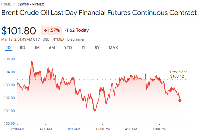 布伦特原油期货收涨 3.21 美元,涨幅 3.2%,报每桶 103.42 美元;美国 4 月交割的西得州中质原油(WTI)上涨 2.71 美元,涨幅 2.9%,收于每桶 96.21 美元。