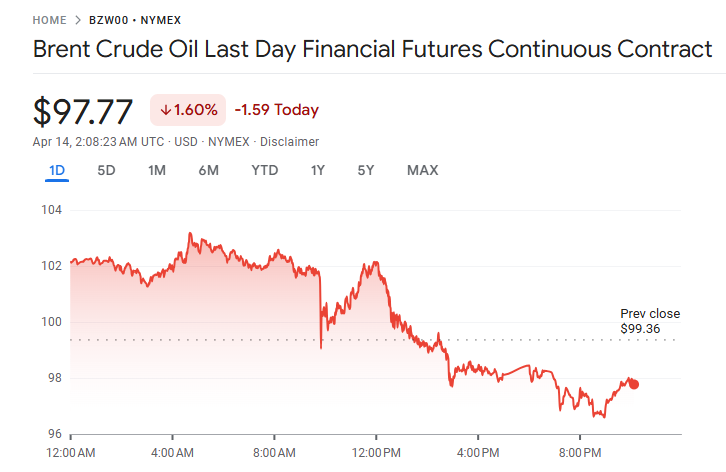 近日因美国对伊朗港口实施封锁,可能进一步收紧全球原油供应,导致国际油价出现上涨。布伦特原油上涨 4.4%,收于每桶 99.36 美元;5 月交割的 WTI 原油上涨 2.6%,收于每桶 99.08 美元。