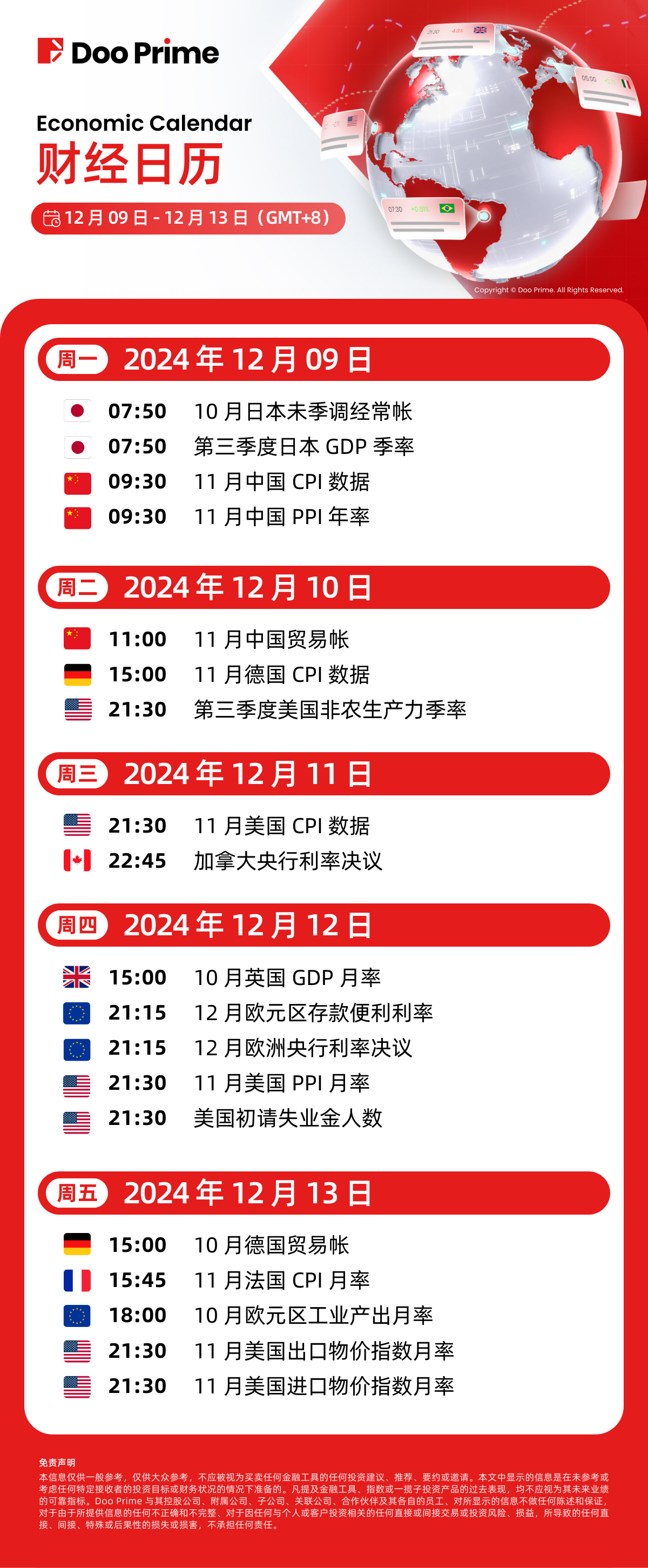 财经日历 | 以下为 2024/12/09– 2024/12/13(GMT+8 北京时间) 全球重大经济事件提醒。在重大行情期间,请确保您已审查您的保证金率,并有足够的保证金来支撑您的风险敞口。
