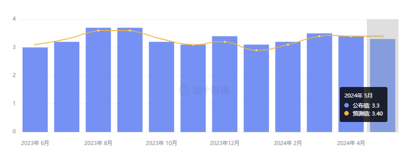 剔除食品和能源成本后的 5 月核心 CPI 同比增长 3.4%,低于预期 3.5%,也低于前值 3.6%,为三年多以来的最低水平;环比增速从 4 月份的 0.3% 下降至约 0.2%,弱于预期的 0.3%。