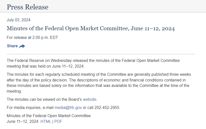 3 日,美联储公布了 6 月 11 日至 12 日的联邦公开市场委员会(FOMC)货币政策会议纪要。