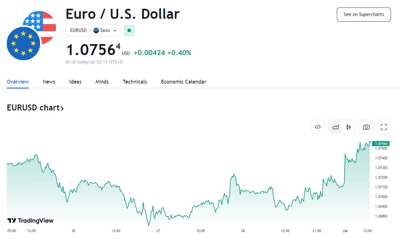 7 月 1 日亚洲市场早盘,法国极右翼在第一轮投票中的优势料不及市场所忧,欧元涨幅扩大。7 月 1 日,法国第一轮大选中极右翼拔得头筹,欧元开盘跳涨约 30 点,随后震荡走高,最高触及 1.0758,为近两周新高,涨幅约 0.43%。