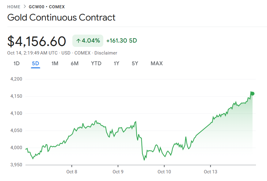 10 月 13 日至 14 日,受中美贸易关系再度紧张以及市场预期美国将进一步降息影响,资金持续涌入贵金属市场,金价首次突破每盎司 4100 美元大关再创历史新高,银价同步刷新纪录。