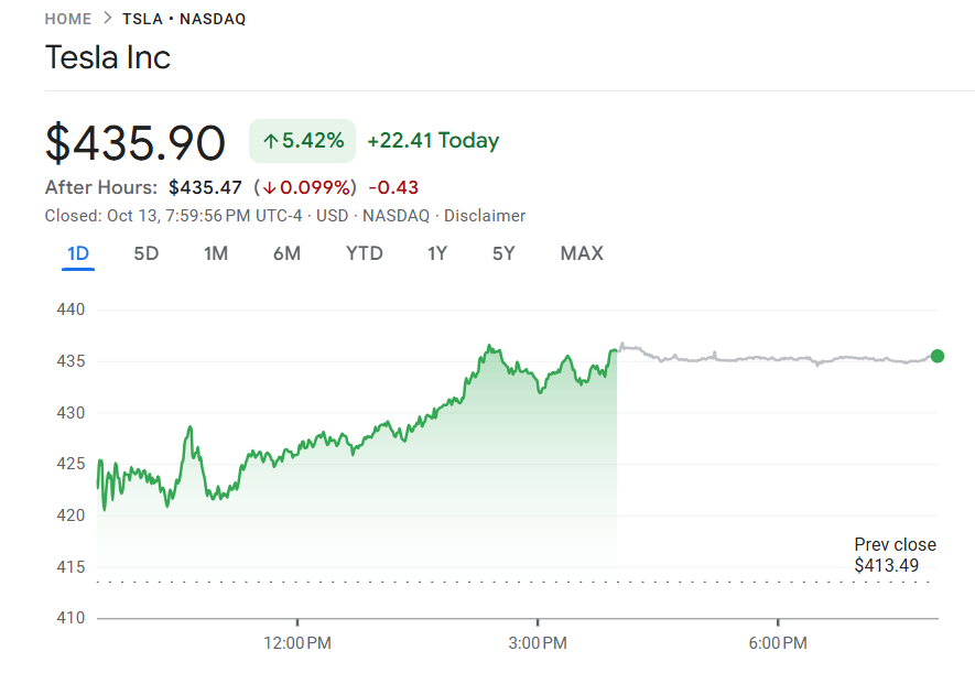 10 月 13 日至 14 日,美国电动车龙头特斯拉(TSLA)在连续两日大跌 5.78% 后,周一强势反弹 22.41 美元或 5.42%,收报 435.90 美元,成为“科技七巨头”中表现最亮眼个股,成交额达 337.96 亿美元,为美股之最。
