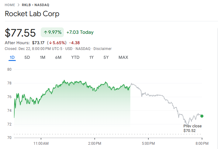 12 月 22 日至 23 日,Rocket Lab USA, Inc. 股价周三突破 74.26 美元,创下历史新高,标志着这家航空航天制造商及小型卫星发射服务提供商在资本市场上取得重要里程碑。过去一年中,公司股价累计上涨 183.55%,近六个月内涨幅达 134.75%,显著跑赢同业,反映其在快速成长的太空产业中持续扩大市场版图并成功执行战略规划。