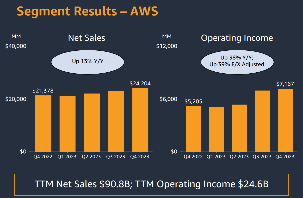 亚马逊云业务 Amazon Web Service 则在连续几个季度的表现不佳之后出现了反弹,营收同比收入增长了 13%,达到 242 亿美元,而过去两个季度的销售增幅为 12%。