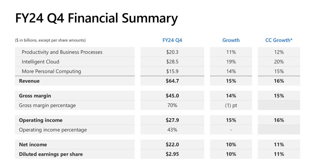 30 日,美股盘后,微软公布截至 6 月 30 日的 2024 财年第四财季财务数据: